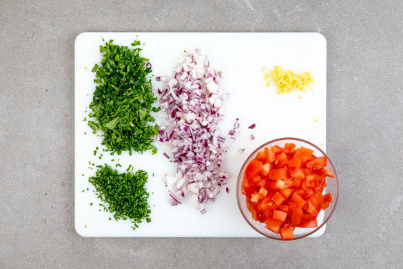 Die Tomaten in kleine Würfel schneiden, dabei den Strunk entfernen. Die Zwiebel schälen, halbieren und in feine Würfel schneiden. Den Ingwer schälen und sehr fein würfeln oder reiben. Die Petersilie und den Koriander samt Stängeln fein schneiden. Den Schnittlauch in kleine Röllchen schneiden. Die Limettenschale abreiben, dann die Limette halbieren und auspressen.