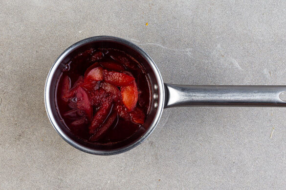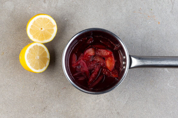 Die Zitrone halbieren und auspressen. Das Pflaumenkompott mit Zitronensaft abschmecken, vom Herd nehmen und beiseitestellen.