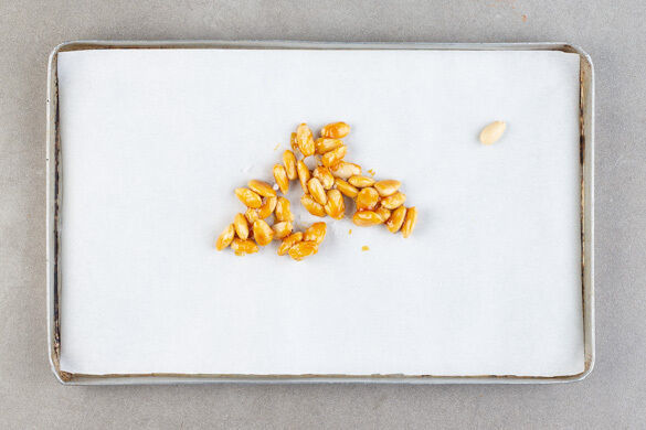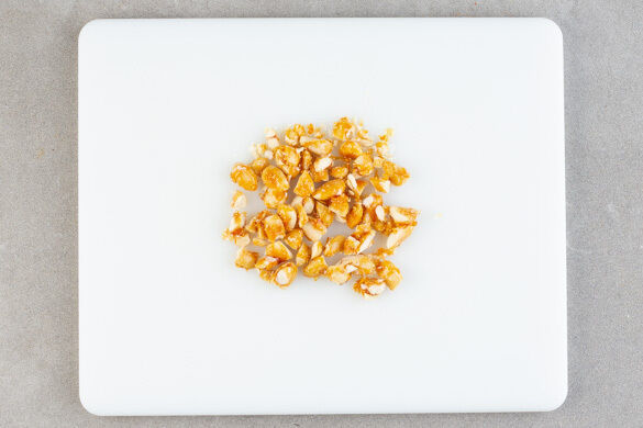 1 Blatt Backpapier bereitlegen. In einem mittelgroßen Topf 30g Zucker bei mittlerer Hitze karamellisieren lassen, dann die Hitze reduzieren. 1 Mandel als Überraschung beiseitelegen und die restlichen Mandeln mit dem Zucker vermengen, auf das Backpapier geben und nach Geschmack mit etwas Salz (z. B. Fleur de Sel) bestreuen. An einem kühlen Ort leicht aushärten lassen.