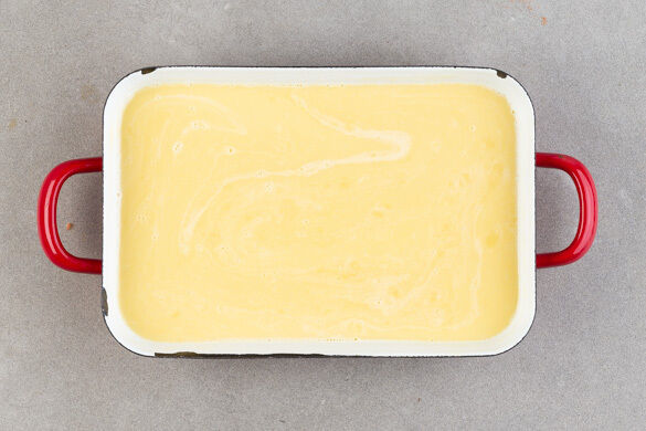 Mit der Sahne ablöschen, 1 Prise Salz zufügen und unter Rühren weitere 4–5Min. köcheln, bis sich der Zucker vollständig aufgelöst hat und die Sahne leicht eingedickt ist. 500ml Milch angießen und unter Rühren einmal aufkochen, den Milchreis in eine mittelgroße tiefe Auflaufform geben und im Ofen 40–45Min. garen.
