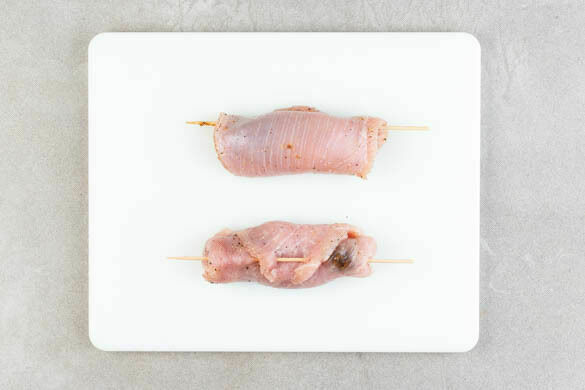 Das Fleisch mit etwas Küchenkrepp abtupfen, zwischen Frischhaltefolie mit einer schweren Pfanne oder einem Fleischklopfer ca. 0,5cm dünn klopfen und von beiden Seiten kräftig mit Salz und Pfeffer würzen. Die Füllung auf dem Fleisch platzieren, das Fleisch aufrollen und die Rouladen mit einem Zahnstocher oder Schaschlikspieß fixieren.