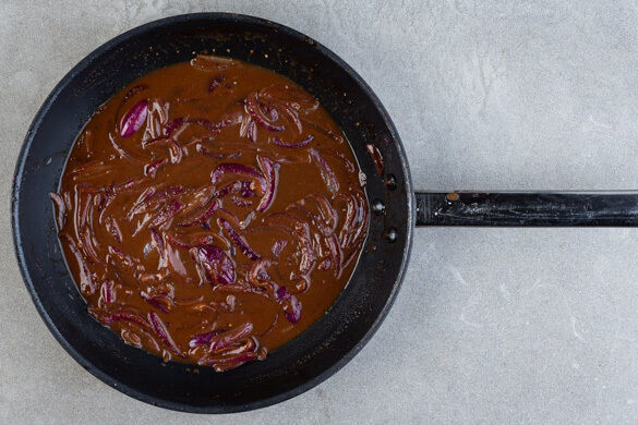 In einer mittelgroßen Pfanne 1EL Olivenöl stark erhitzen, darin die Zwiebeln mit 1TL Zucker und 1/2TL Salz 5–6Min. anbräunen. 1TL Mehl unterrühren, mit 250ml Wasser ablöschen und die Sauce bei mittlerer Hitze 3–4Min. einköcheln lassen. Tipp: Für noch mehr Geschmack 100ml Rotwein und 150ml Wasser verwenden.