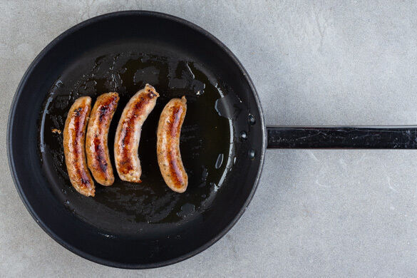 Die Wildschweinbratwürste in einer großen Pfanne mit 1EL Olivenöl bei starker Hitze auf jeder Seite ca. 1Min. knusprig anbraten, die Hitze reduzieren und die Würste weitere 4–5Min. auf jeder Seite braten.