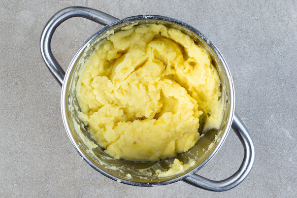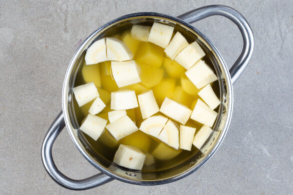 Den Backofen auf 210°C Umluft (230°C Ober-/Unterhitze) vorheizen. Die Pastinake und die Kartoffeln schälen, grob würfeln und in einem mittelgroßen Topf mit Wasser bedecken, 1TL Salz zugeben, abgedeckt zum Kochen bringen und bei mittlerer Hitze in 12–13Min. gar köcheln lassen. In ein Sieb abgießen und abtropfen lassen, anschließend in den Topf zurückgeben und abgedeckt warm halten.