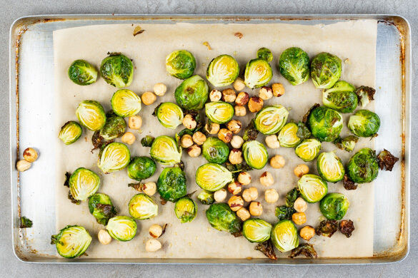 Den Rosenkohl halbieren, auf einem mit Backpapier ausgelegten Backblech mit 1EL Olivenöl und je 1 kräftigen Prise Salz und Pfeffer vermengen und im Ofen 10–12Min. backen. Die Haselnüsse untermengen und den Rosenkohl mit den Nüssen weitere 5Min. rösten.