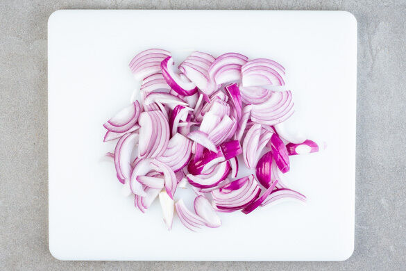 Die Zwiebeln schälen, halbieren und in feine Streifen schneiden.