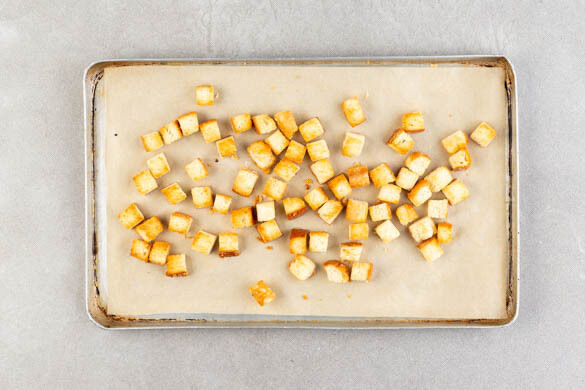 Den Backofen auf 180°C Umluft (200°C Ober-/Unterhitze) vorheizen. Die Brötchen in ca. 1cm große Würfel schneiden, auf einem mit Backpapier ausgelegten Backblech mit 1–2EL Olivenöl und 1 Prise Salz vermengen und im Ofen in 8–10Min. goldbraun und knusprig rösten.