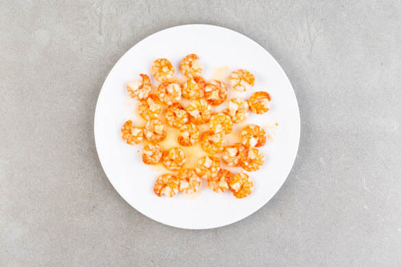 Die Garnelen in einer mittelgroßen Pfanne mit 1EL Olivenöl bei starker Hitze von allen Seiten 1–2Min. anbraten, aus der Pfanne nehmen und leicht abkühlen lassen.