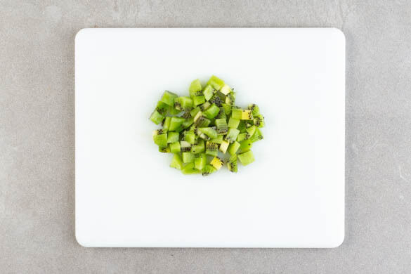 Die Kiwis halbieren, das Fruchtfleisch mit einem Löffel herauslösen und in ca. 1cm große Würfel schneiden.