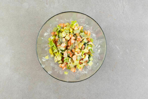 Die Gurke in ca. 1cm große Würfel schneiden. Die Garnelen in kleine Stücke schneiden.