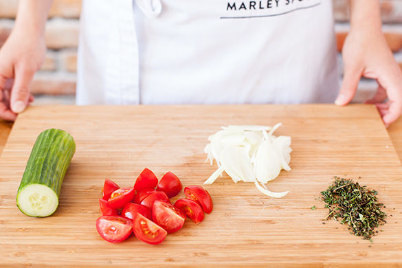Die Tomaten waschen und vierteln. Zwiebel schälen, halbieren und in feine Streifen schneiden. Die Thymianblätter grob von den harten Stielen zupfen und fein hacken. Gurke waschen.