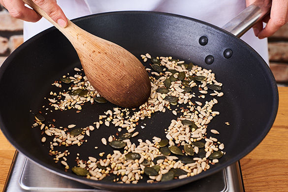 Inzwischen in einer Pfanne bei mittlerer Hitze die Körnermischung ohne Öl 1-2Min. goldbraun rösten. Die Petersilie ohne harte Stiele und den Schnittlauch fein hacken.