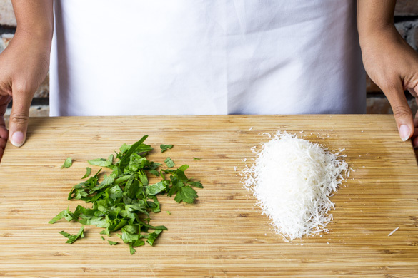 Die Pilze ggf. säubern und in dünne Scheiben schneiden. Die Zwiebeln und den Knoblauch schälen und fein würfeln. Die Petersilienblätter abzupfen, die Blätter und die Stängel separat fein hacken. Das Brühgewürz in 1,5L heißem Wasser auflösen.