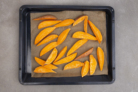 Den Backofen auf 200°C Umluft (220°C Ober-/Unterhitze) vorheizen. Die Süßkartoffel längs halbieren, in 1–2cm dicke Spalten schneiden und auf ein mit Backpapier ausgelegtes Backblech geben.