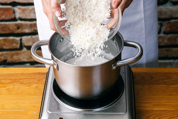150ml Kokosmilch und 150ml Wasser in einem mittelgroßen Topf zum Kochen bringen. Den Reis in einem Sieb unter fließendem Wasser abspülen, bis das Wasser klar bleibt. Sobald das Kokoswasser kocht, den Reis hinzugeben und bei niedrigster Hitze abgedeckt 10–12Min. kochen, bis die Flüssigkeit aufgesogen ist. Noch ca. 5Min. ohne Hitzezufuhr abgedeckt ziehen lassen.