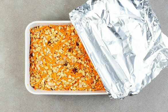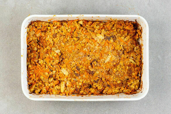 Nein, für dieses leckere Frühstück am Morgen danach mussten keine Katzen leiden – versprochen! Hier gibt’s ausschließlich Leckereien nichtfeliner Natur: nährende Haferflocken, frische Karotten, exotisch-fruchtige Ananas, aromatische Walnüsse, süße Rosinen und leckere Joghurtcreme! Bei Bedarf schon am Vorabend fix vorbereitet lässt sich das Porridge morgens einfach in den Ofen schieben. Da haben Kopfschmerzen gar keine Chance!
