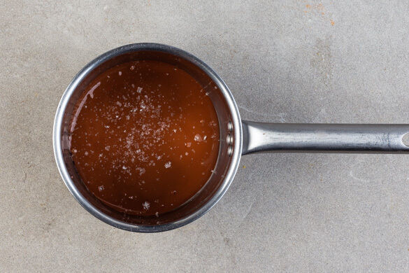 Den Orangentopf ausspülen und gut abtrocknen. Die Schokodrops in den Topf geben und bei niedriger bis mittlerer Hitze unter häufigem Rühren langsam schmelzen lassen, mit 1 Prise Salz verfeinern.