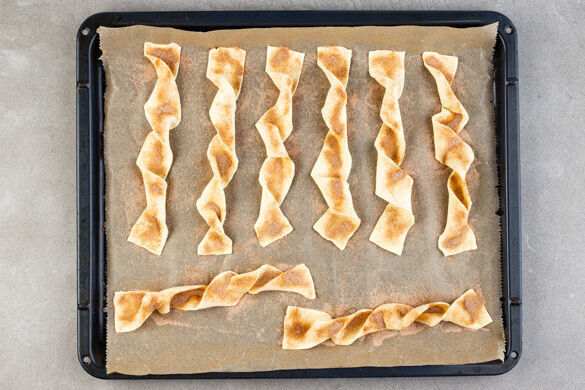 Den Zimt mit 4EL Zucker vermischen. Den Teig mit dem Papier nach unten auf einem Backblech ausrollen, quer in ca. 3cm breite Streifen schneiden und zwei- bis dreimal eindrehen, dafür die Enden in entgegengesetzte Richtungen drehen. Gleichmäßig mit je 1TL Zimtzucker bestreuen und im Ofen in 10–12Min. knusprig backen.