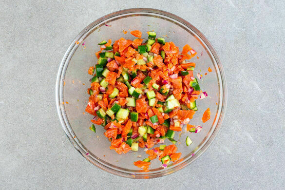 Den Lachs klein schneiden und mit der Gurke, den Zwiebeln, dem Limettensaft und -abrieb und der Sweet-Chili-Sauce vermengen. Mit Salz und Pfeffer sowie ggf. Essig abschmecken und kühl beiseitestellen.