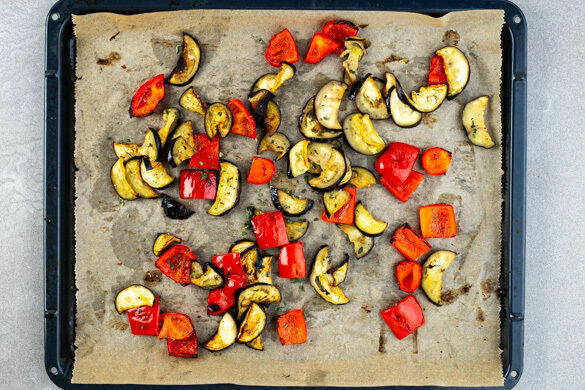 Die Paprika halbieren, entkernen und grob würfeln. Mit den Auberginen und 2/3 des Knoblauchs auf einem mit Backpapier ausgelegten Backblech mit 2–3EL Olivenöl, 1/2TL Salz und 1 kräftigen Prise Pfeffer vermengen, gleichmäßig verteilen und 15–20Min. im Ofen rösten, bis das Gemüse gar ist. Tipp: Wer mag, kann für die letzten ca. 5Min. den Grill zuschalten.