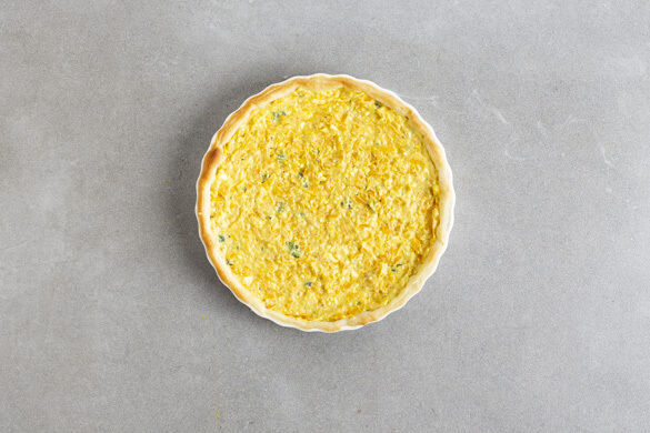 Den Backofen auf 210°C Umluft (230°C Ober-/Unterhitze) vorheizen. Eine runde Quicheform mit dem Quicheteig auskleiden, überstehenden Teig ggf. entfernen. Den Teig mit Backpapier und Reis oder anderen trockenen Hülsenfrüchten als Backgewicht bedecken und 10–12Min. im Ofen vorbacken. Das Backpapier und Backgewicht anschließend entfernen.