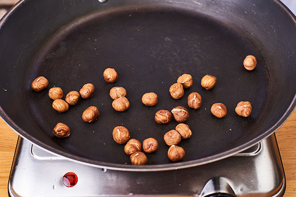 Inzwischen die Haselnüsse in einer großen Pfanne bei mittlerer Hitze ca. 1-2Min. ohne Öl goldbraun anrösten. Vorsicht, Nüsse verbrennen schnell. Dann aus der Pfanne nehmen, beiseitestellen und die Pfanne wieder auf den Herd stellen. Leicht abgekühlte Nüsse grob hacken.