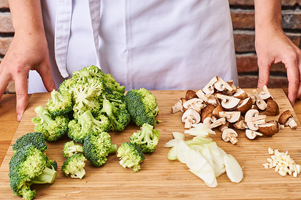Einen großen Topf mit ausreichend gesalzenem Wasser zum Kochen bringen. Brokkoli in mundgerechten Rösschen vom Strunk schneiden, den Strunk schälen und in dünne Scheiben schneiden. Zwiebel schälen, halbieren und in feine Streifen schneiden. Pilze ggf. putzen und vierteln. Knoblauch schälen und fein hacken.