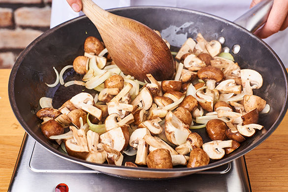 Pilze und Zwiebeln in der Pfanne mit 1EL Öl bei mittelhoher Hitze ca. 5Min. anbraten, dann den Knoblauch ca. 1Min. mitbraten.