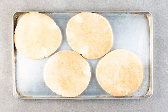 8 Pitabrote auf einem Backblech 4–6Min. im Ofen erwärmen. Tipp: Wer großen Hunger hat, kann auch alle Pitabrote verwenden.
