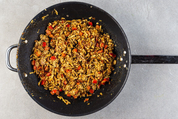 Die Paprika und die restlichen Zwiebeln in einer großen Pfanne mit 1EL Olivenöl bei mittlerer Hitze ca. 2Min. anbraten. Den Tempeh und den restlichen Knoblauch zugeben und alles weitere 6–7Min. anbraten, bis der Tempeh goldbraun und leicht knusprig ist, dabei nach Bedarf etwas mehr Öl hinzugeben. Mit Salz und Pfeffer abschmecken.