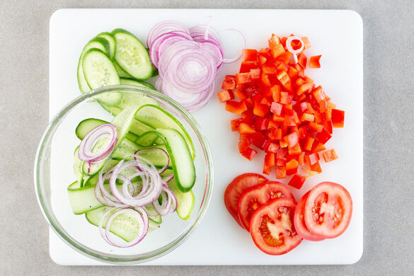 Die Paprika entkernen und in kleine Würfel schneiden. Die Tomaten in dünne Scheiben schneiden. Die Zwiebel schälen und in feine Ringe schneiden. Einige Gurkenscheiben abschneiden und beiseitelegen. Die übrige Gurke mit einem Sparschäler in lange Scheiben schneiden und mit 1/4 der Zwiebeln, 1TL Olivenöl, 2TL (hellem) Essig, 1TL Zucker und 1 Prise Salz und Pfeffer vermengen.