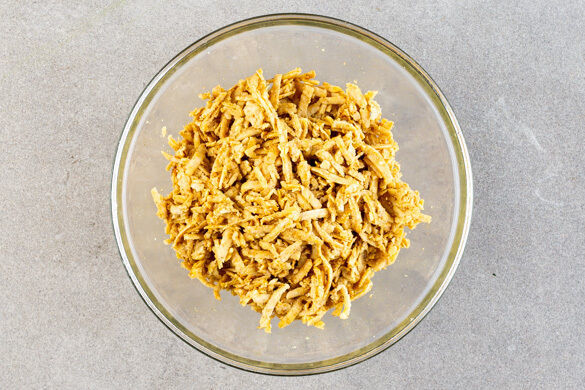 Den Backofen auf 220°C (200°C Umluft) vorheizen. Den Tempeh mit einer Küchenreibe grob raspeln, dann mit 2EL Olivenöl und der Gewürzmischung vermengen.