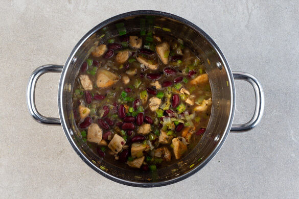 Die Bohnen samt Flüssigkeit und 50ml Wasser zugeben und zum Kochen bringen. Dann die Hitze reduzieren und das Chili 6–7mMin. sanft köcheln lassen.