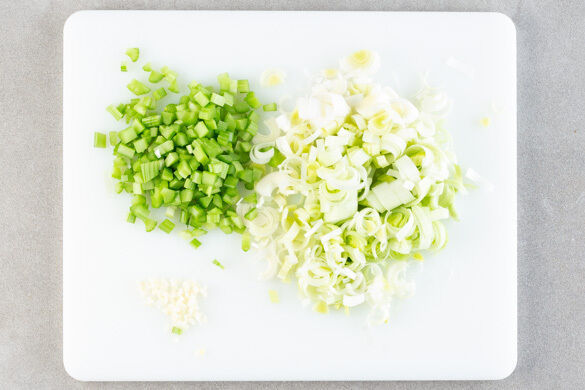 Den Lauch längs halbieren und quer in feine Streifen schneiden. Den Sellerie in kleine Würfel schneiden. Den Knoblauch schälen und fein würfeln.