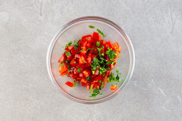 Inzwischen die Tomate in kleine Würfel schneiden. Den Koriander samt Stängeln fein schneiden. Die Limette in Spalten schneiden. Die Tomaten mit dem Koriander, Saft aus 1–2 Limettenspalten und 1 Prise Salz verrühren.