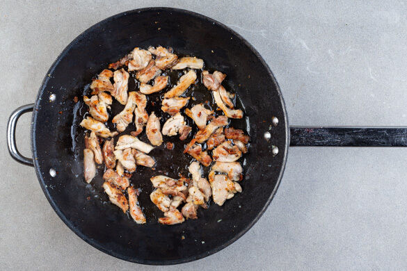 Das Fleisch in einer großen Pfanne mit 1TL Olivenöl bei starker Hitze 4–5Min. rundum anbraten, bis das Fleisch von allen Seiten schön gebräunt und durch ist.