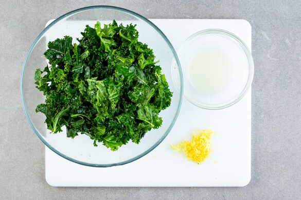 Die Zitronenschale abreiben, dann die Zitronen halbieren und auspressen. Den Grünkohl mit ca. 3/4 des Zitronensafts und 1TL Salz 1–2Min. kräftig durchkneten, bis der Grünkohl weich wird.