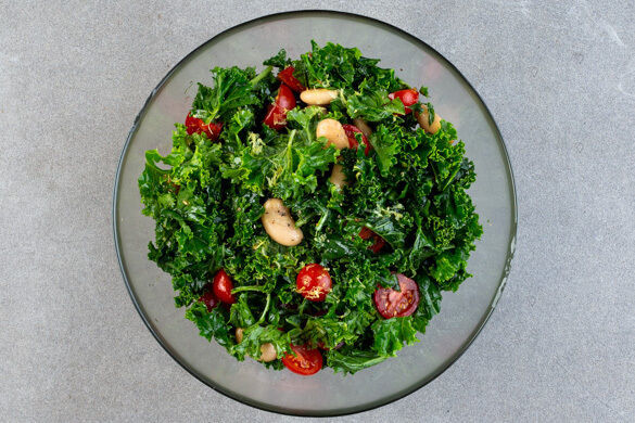 Grünkohl geht nur schwer und fettig? Von wegen! Dieser frische Salat versorgt dich nicht nur mit besonders viel β-Carotin und Vitamin C, die weißen Bohnen und das zarte Hähnchenschenkelfleisch warten auch mit einer Extraportion Eiweiß auf. Die Knochen haben wir schon entfernt, so geht es noch schneller! Dazu gibt’s fruchtige Cherrytomaten, süßsauer eingelegte Zwiebeln, pikanten Käse und ein spritziges Zitronendressing. Lecker!