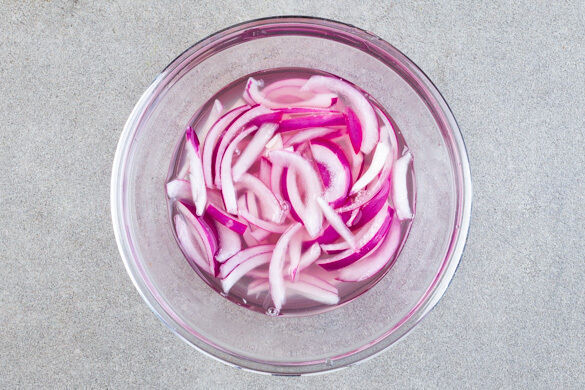 Die Zwiebeln schälen, halbieren und in feine Streifen schneiden. Mit 80ml heißem Wasser, 2EL Essig, 2TL Zucker und 2 Prisen Salz vermengen und beiseitestellen.