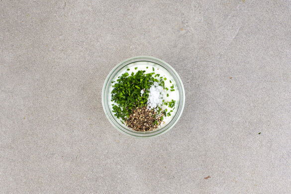 Die saure Sahne mit 1/2TL Limettenschale, 1EL Limettensaft und je 1 Prise Salz und Pfeffer verrühren. Den Dip bis zum Servieren kühl stellen.