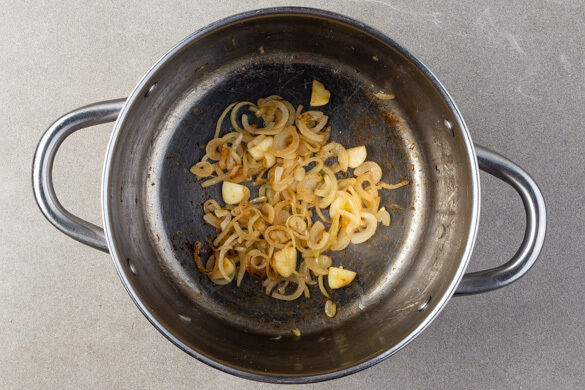 Die Zwiebeln und den Knoblauch in einem großen Topf mit 1EL Pflanzenöl und 1 Prise Salz bei starker Hitze 2–4Min. anbraten, bis die Zwiebeln leicht gebräunt sind.