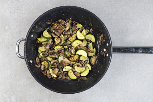 Die Pilze in einer großen Pfanne mit 1EL Olivenöl bei starker Hitze und 4–5Min. anbraten, dabei nicht umrühren. Die Zucchini, den Knoblauch, die Gewürzmischung und 1 kräftige Prise Salz unterrühren und das Gemüse weitere 2–3Min. anbraten.