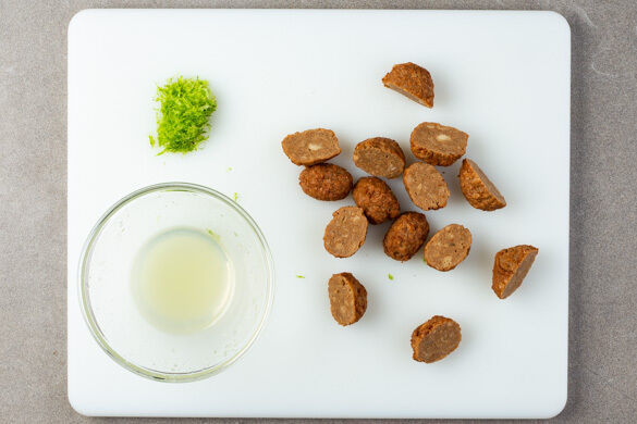 Die Limettenschale fein abreiben, dann die Limette halbieren und auspressen. Die Hackbällchen halbieren.