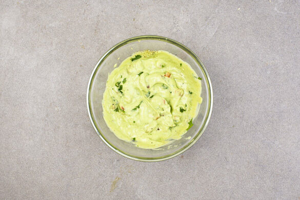 Die Limette halbieren und eine Hälfte auspressen, die andere Hälfte in Spalten schneiden. Die Guacamole mit dem Limettensaft und dem restlichen Knoblauch verfeinern. Die Korianderblätter und die restlichen Tomaten untermengen und mit Salz und Pfeffer abschmecken.
