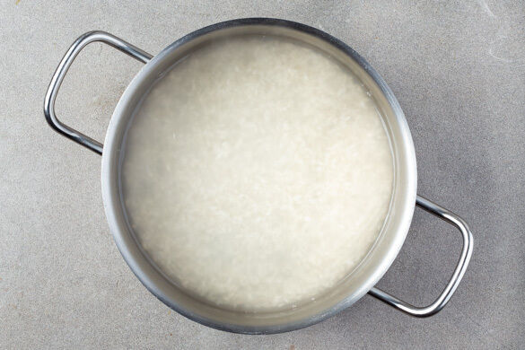 In einem mittelgroßen Topf 400ml Wasser für den Reis zum Kochen bringen. Den Reis mit 1 Prise Salz in das kochende Wasser geben und abgedeckt bei mittlerer Hitze ca. 10Min. köcheln lassen.