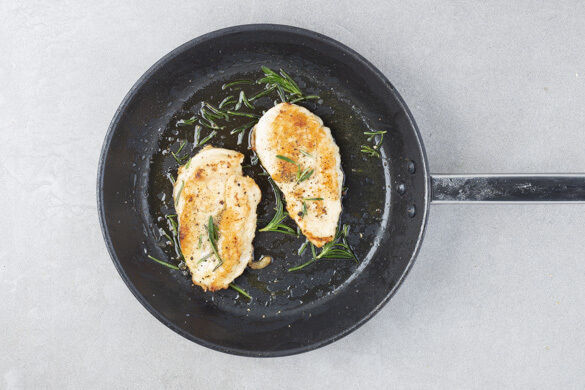 Das Fleisch in der Pfanne mit 1–2EL Olivenöl bei mittlerer Hitze auf jeder Seite 1–2Min. anbraten. Den Rosmarin dazugeben und das Fleisch mit etwas Zitronensaft beträufeln und mit Salz und Pfeffer würzen. Die Pfanne vom Herd nehmen und das Fleisch vor dem Anschneiden in der Pfanne ruhen lassen.