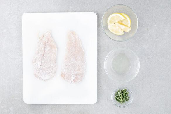 Das Fleisch mit etwas Küchenkrepp trocken tupfen und längs in 2 gleich große Stücke schneiden, dann mit einem Fleischklopfer oder einer schweren Pfanne ca. 1cm dünn ausklopfen. In 1–2EL Weizenmehl wenden, so wird es beim Braten leicht knusprig. Die Zitrone halbieren, eine Hälfte auspressen, die andere Hälfte in Spalten schneiden. Die Rosmarinnadeln abzupfen.