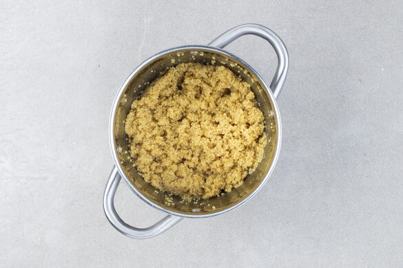 In einem mittelgroßen Topf 450ml Wasser mit dem Brühgewürz aufkochen. Den Knoblauch schälen und fein würfeln. Die Orange auspressen und den Saft mit dem Knoblauch, 1–2EL Olivenöl, 2EL Essig und 1–2TL Gewürzmischung zur Brühe geben. Erneut aufkochen, dann die Quinoa unterrühren und abgedeckt 10–12Min. bei niedriger bis mittlerer Hitze sanft köcheln lassen.