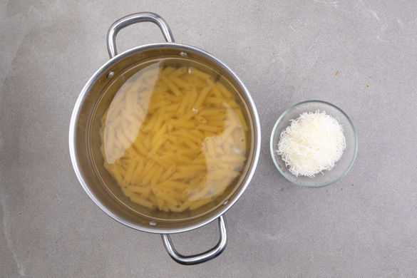Den Käse fein reiben. Die Pasta in das kochende Wasser geben und in 7–9Min. bissfest kochen. Mit einem Messbecher ca. 200ml Pastawasser abschöpfen, dann die Pasta in ein Sieb abgießen, abtropfen lassen, zurück in den Topf geben und warm halten.