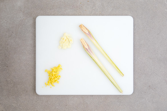 Den Ingwer schälen und in kleine Würfel schneiden. Den Knoblauch schälen und in hauchdünne Scheibchen schneiden. Die Zitronengrasstange längs halbieren.